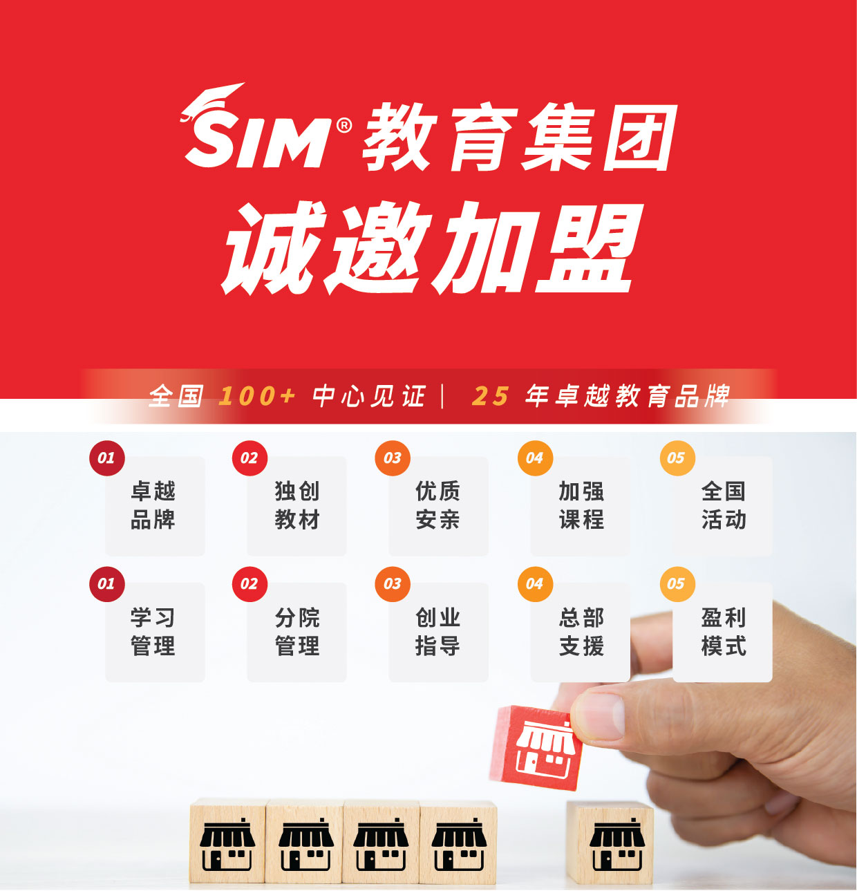 品牌简介 SIM 教育集团创立于1999年,由李碧华院长创办,始终坚持「一心为孩子」的教育使命,深耕儿童教育二十余年。 目前,SIM 在全马已设有 超过 40 家连锁教育中心,主要分布于北马与中马地区,服务对象为 7-12 岁的小学生,课程涵盖课业辅导与安亲照护,提供一站式成长支持。 除了直营分中心,SIM 研发的 EduAtive Programme 系列教材与系统,也广泛被全马超过 30 家非直营补习中心采用,有效提升教学品质与学习成效。 此外,SIM 也与旗下学前品牌 Dmonte Preschool 合作紧密,全国已有 30 多家幼儿园中心采用 SIM 课程或教学理念,形成从幼儿园到小学阶段的完整教育生态。 |
